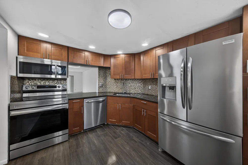 This condominium features updates completed in 2022, stainless steel kitchen appliances (French door refrigerator, range, and microwave), interior paint, flooring, and LED lighting throughout. The kitchen includes custom cabinetry, a pantry, and granite countertops. Both bedrooms have walk-in closets, with an additional closet in Bedroom 1. The unit includes on-site storage. A screened, tiled patio overlooks the pool. Association dues include internet, cable, trash, water, and contributions to reserves. The community offers a 24-hour guard-gated entrance and laundry facilities on every level.